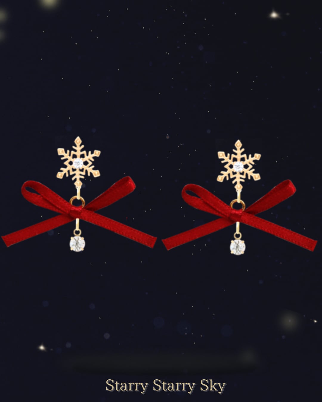 雪の結晶モチーフと赤いリボンを組み合わせた、冬限定のきらめきアクセサリーです。